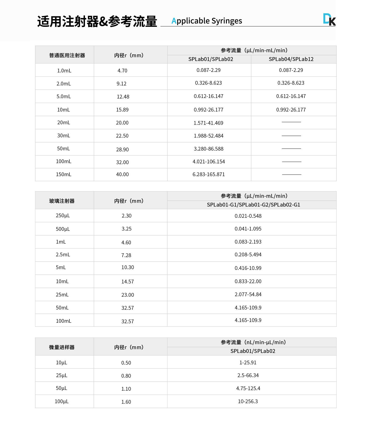 線速度范圍:5μm/min-132mm/min(流量=線速度*注射器內(nèi)截面積)